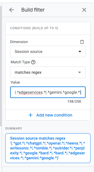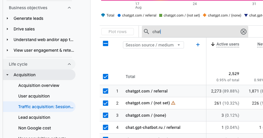 In the dropdown menu, choose session source/medium and search for an AI assistant tool. In this example I searched for chatgpt.
