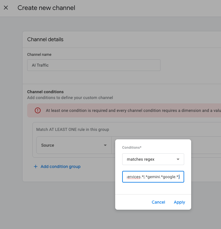 In the channel group, click Add new channel and give it a name. Something like ‘AI Traffic’ or ‘LLMs’.